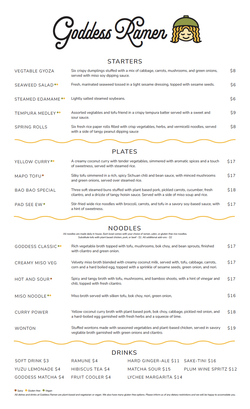 Goddess Ramen sets itself apart because of its commitment to inclusivity and sustainability. Our brand prides itself on being 100% plant based, accommodating dietary restrictions as well as reducing overall meat consumption in the area. The atmosphere at Goddess Ramen is fun and inviting to all. Our noodles are made from scratch and our ingredients are fresh and locally sourced. We provide great food with a mission to make all customers’ lives a little better.