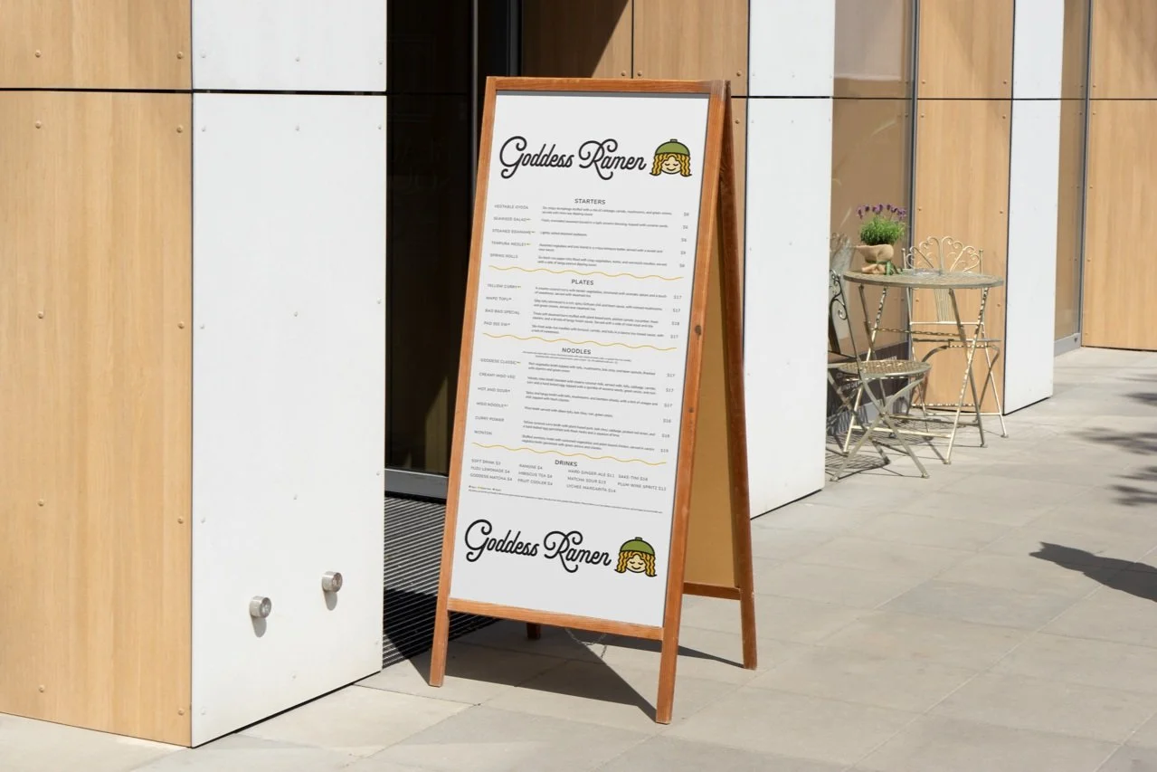 The typography creates a balance between playfulness and professionalism, reflecting the brand’s inclusive and sustainable mission. The clean and modern Nunito Light ensures legibility and simplicity, making it ideal for functional uses like menus or descriptions. In contrast, the expressive and rounded Selfie Neue Round Bold adds warmth, charm, and a sense of fun, aligning with the brand’s inviting and approachable personality. Together, these typefaces create a cohesive visual identity that resonates with Goddess Ramen’s mission to provide delicious, plant-based ramen in a welcoming and joyful atmosphere.