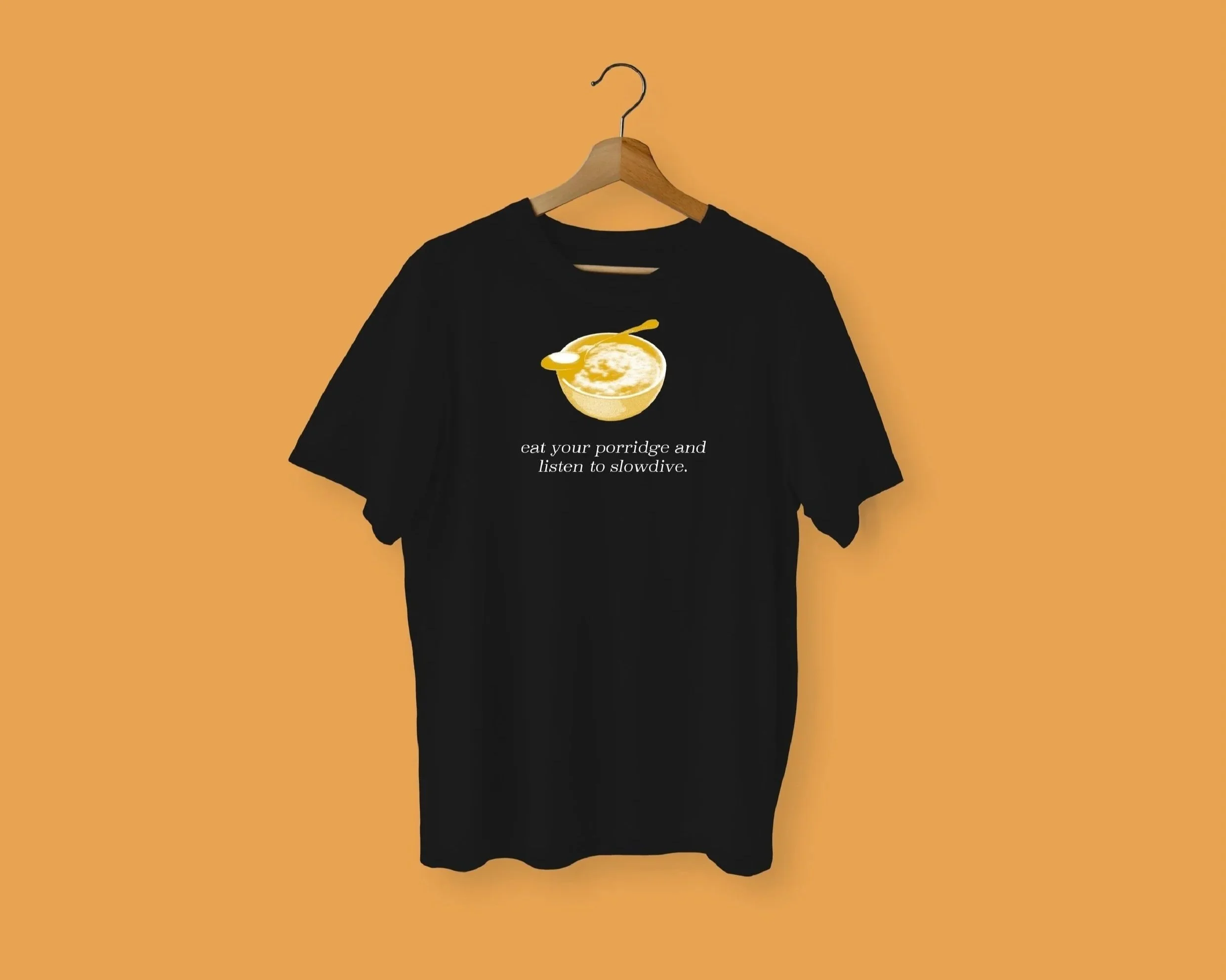 As an informational deliverable I created a porridge box that tells you about the history of Slowdive and the shoegaze genre. It is a nod. to my dry humor, as if someone didn’t like Slowdive, I made a box of oats they can drown on, like the quote declared. The box has the potential to serve as a fully functioning product, as I also included ingredients and nutrition facts. My second deliverable was a t-shirt that also goes with the porridge theme. It displays a bowl of porridge and says “eat your porridge and listen to Slowdive” because if they were a Slowdive hater they would choke. I’d like to make clear everyone has their own music taste and that is okay, it is simply a response to the hateful quote. My final deliverable was a Slowdive poster. “Shoegazer” was often used as a derogatory term, so I wanted to design something cool that eliminates the stigma. I leaned into the “gaze” part of shoegaze and it included five pairs of eyes (to represent the five members of the band” with very expressive gazes. All three deliverables use the same elements and assets which were inspired by shoegaze album covers.